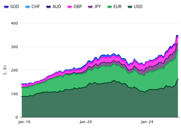 Der AT1-Markt hat sich in zehn Jahren mehr als verdoppelt und erreicht nahezu 350 Milliarden US-Dollar. Im Jahr 2015 waren mehr als 60% der Emissionen in US-Dollar denominiert, was mehr als das Doppelte des Volumens in Euro bedeutete. Banken bevorzugten damals die Tiefe des US-Anleihenmarktes.