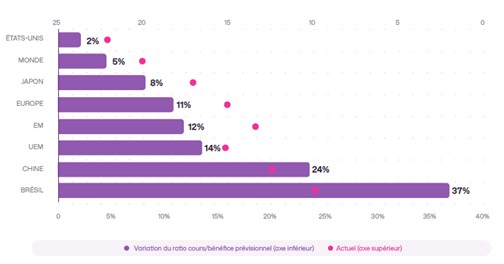 Aktuelles Niveau und Veränderung des erwarteten Kurs-Gewinn-Verhältnisses (KGV) in 12 Monaten