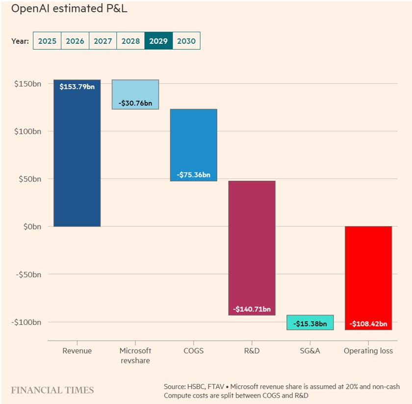 Cette dynamique s’est cependant inversée ces dernières semaines. Désormais, un lien étroit avec OpenAI est perçu comme un risque plutôt qu’un atout. SoftBank, qui détient environ 11 % du capital d’OpenAI, a chuté de près de 40 % en novembre. L’action Oracle, qui s’était envolée après l’annonce d’un accord d’infrastructure colossal à 300 milliards de dollars, voit désormais ses credit-default swaps s’écarter sensiblement, les investisseurs réévaluant le risque de construire des capacités massives pour un client dont la solidité financière apparaît nettement plus fragile qu’escompté. Même Microsoft, pourtant protégé par sa taille et sa diversification, n’a pas échappé aux pressions. HSBC estime désormais qu’OpenAI pourrait cumuler près de cinq-cents milliards de dollars de pertes opérationnelles d’ici 2030, une estimation qui soulève de sérieux doutes quant à la viabilité financière d’un écosystème déjà alourdi par des investissements colossaux, un recours accru à l’endettement et des valorisations élevées.
