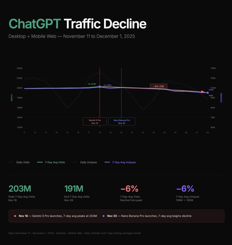 Ce choc de performance a exercé une pression tangible sur le «Complexe OpenAI». Sam Altman aurait diffusé une note interne de «code rouge» après le lancement de Gemini 3, reconnaissant la menace croissante posée non seulement par Google, mais aussi par Claude d’Anthropic. Les données SimilarWeb montrent que le trafic de ChatGPT a chuté d’environ 6 % dans les semaines suivant l’arrivée de Gemini 3, passant de 203 millions à 191 millions de visites quotidiennes.