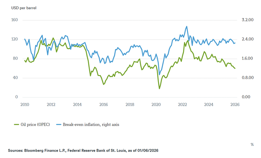 Unsere Grafik der Woche veranschaulicht den traditionellen Mechanismus, der in letzter Zeit die Aufmerksamkeit der Märkte auf sich gezogen hat. Die Gleichgewichts-Inflationsraten entsprechen der Differenz zwischen den Renditen inflationsindexierter Anleihen und den Renditen nominaler Anleihen. Sie werden im Allgemeinen als Indikator für die Inflationserwartungen am Anleihemarkt angesehen. Es ist interessant festzustellen, dass diese Inflationserwartungen eng mit dem Ölpreis korreliert sind, wie durch unsere Grafik der Woche gezeigt wird. Zwei Gründe erklären diese enge, aber instabile Verbindung. Erstens wirken sich die Ölpreise direkt auf die Gesamtinflation der Verbraucherpreise aus, über die Kosten für Energie und Transport. Zweitens übertragen die Ölpreise Echtzeitinformationen über die Nachfrage eines breiten Spektrums von Haushalten und Unternehmen. Daher führt ein Rückgang der Ölpreise oft zu einer allgemeinen Abschwächung der Gesamtnachfrage, was auf ein potenziell moderateres Wachstum hindeutet und zu einem Rückgang der Renditen.