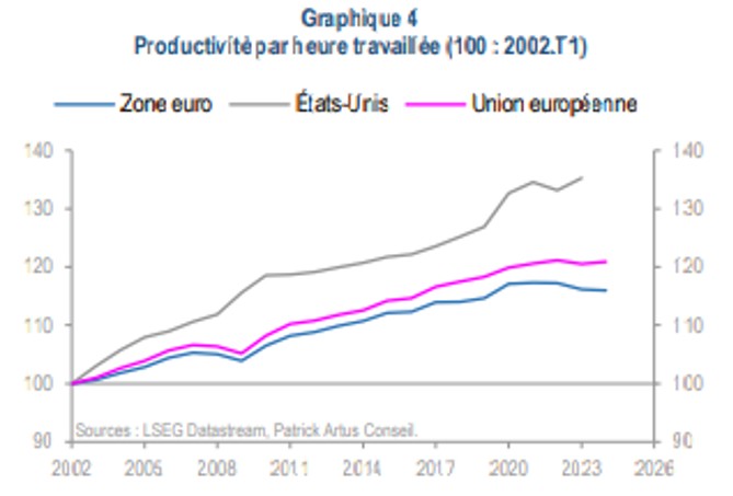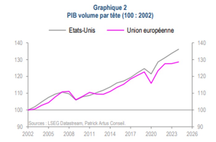Das BIP im Volumen pro Kopf ist zwischen 2002 und 2024 in Europa um 6,2% weniger gestiegen als in den Vereinigten Staaten. Im gleichen Zeitraum ist die Arbeitsproduktivität pro Stunde in Europa um 12% weniger gestiegen als in den Vereinigten Staaten.
