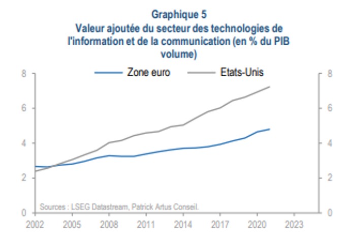 Im Jahr 2022 betrug der Anteil der IKT am BIP in den Vereinigten Staaten 7,3%, gegenüber 4,9% in der Eurozone.