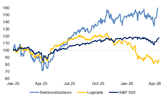 Seit 2026 trägt KI den Technologiessektor nicht mehr homogen. Die dem KI-Infrastruktursektor ausgesetzten Werte, insbesondere Halbleiter, erfassen den Großteil der Gewinnrevisionen und treiben die Leistung des Sektors an (+35% seit Jahresbeginn im SOX-Index), während ein Großteil der Software (-20% seit Jahresbeginn im IGV-Index) zunehmend durch agentische KI destabilisiert wird1, die bestehende Anwendungen ersetzen und traditionelle SaaS-Modelle2 destabilisieren kann.