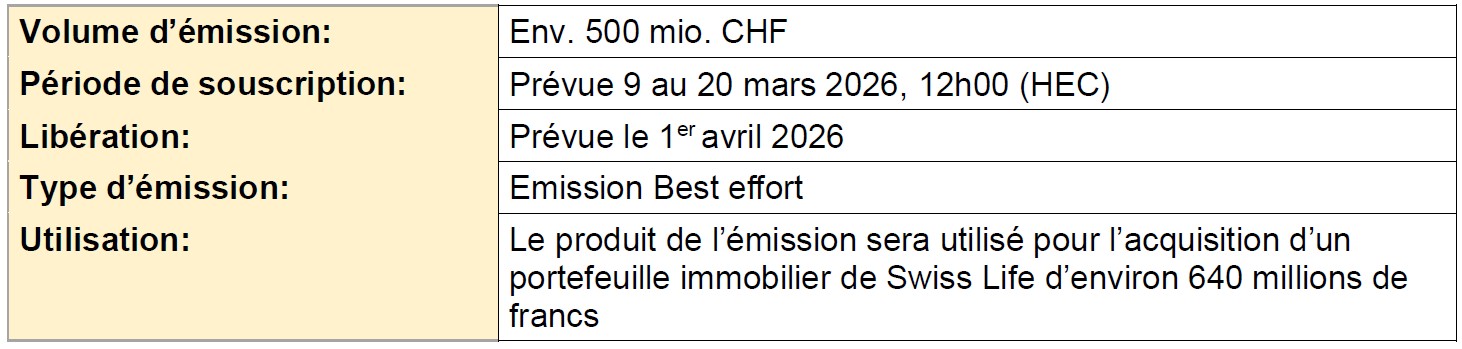 Eine Zeichnungsfrist ist vom 9. bis 20. März 2026 vorgesehen. Danach, vorbehaltlich der Zustimmung der zuständigen internen Gremien, werden die Fondsanteile ab dem 1. April 2026 an der SIX emittiert und gehandelt. Die Anteile werden zum Nettoinventarwert (NAV) ausgegeben, zuzüglich einer Emissionsprovision. Die Emission erfolgt nach dem Prinzip „Best Effort“.