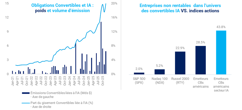 Alors que les capex des principaux hyperscalers devraient atteindre plus de 500 milliards de dollars en 2026, l’IA sera également la principale source de croissance au sein de notre classe d’actifs alors qu’elle représente aujourd’hui près de 20% du gisement mondial selon BofA. Les besoins en financement toujours nombreux dans l’IA conduiront à un volume d’émissions élevé en 2026. Ces émissions nécessiteront une analyse fondamentale et une sélection rigoureuse, alors que plus de 40% des émetteurs ayant un lien avec l’IA n’étaient pas profitables en 2025. Cela ouvre également la porte à une forte disparité de performance au sein même de cette thématique en 2026.