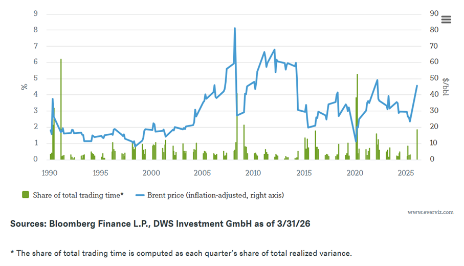 Die Balken erzählen eine interessantere Geschichte. Sie zeigen den Anteil jedes Quartals an der Gesamtdauer des Handels („Trading Time“) – gemessen am Anteil der im jeweiligen Quartal realisierten Varianz.2 Mit anderen Worten: Phasen mit starken täglichen Schwankungen absorbieren einen disproportionalen Teil des Markttresses. Das ist relevant, weil Öl-Schocks oft Folgen haben, die über den bloßen Anstieg der Preise an der Zapfsäule hinausgehen. Sie können Verhaltensweisen verändern. Wenn die Volatilität zunimmt, hören Haushalte, Autohersteller und Regulierungsbehörden auf, Öl als zuverlässigen Input zu betrachten, und beginnen, es als Risiko zu behandeln. Die Ölschocks der 1970er Jahre haben wesentlich zu Effizienzsteigerungen und Substitution beigetragen. Ein anhaltender Schock heute würde wahrscheinlich die Elektrifizierung von Fahrzeugen, Wärmepumpen und andere Formen der Elektrifizierung begünstigen. In diesem Sinne sind Nachfragerückgang und Elektrifizierung keine Alternativen, sondern Teil derselben Nachfragesanpassung.